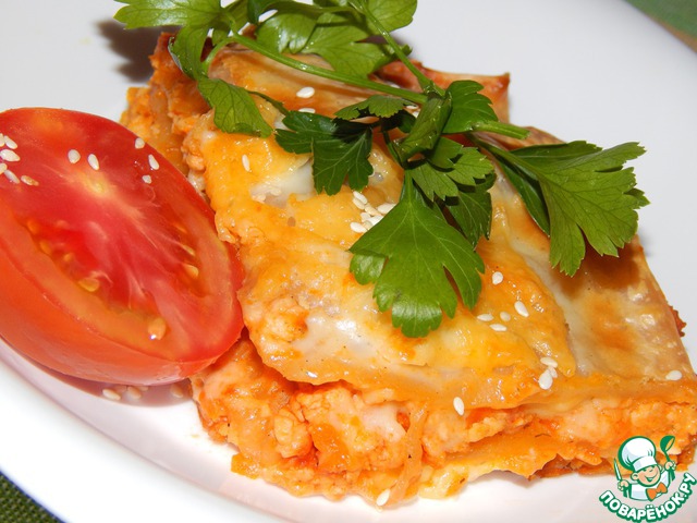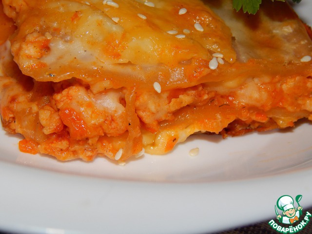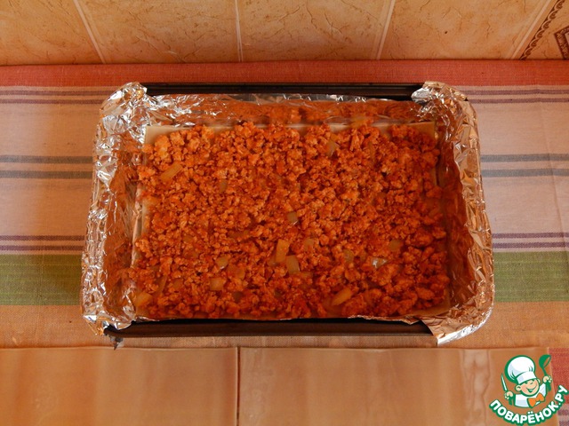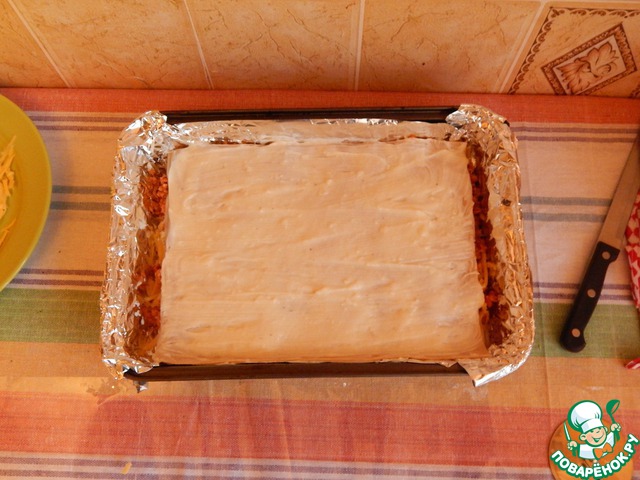 Теперь слой теста, оставшийся фарш, одна часть бешамель, одна часть сыра. Опять тесто и сверху оставшийся соус.