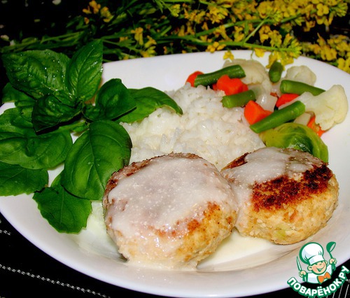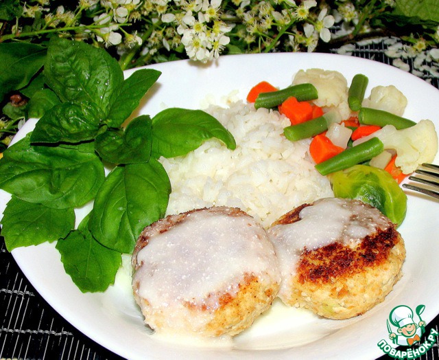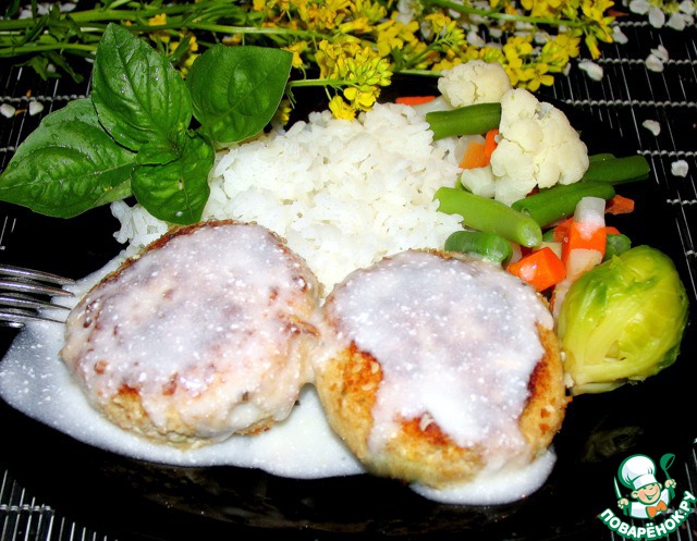 Котлеты обжарить минут пять с одной стороны. Перевернуть на другую строну закрыть сковороду крышкой и отключить плиту.