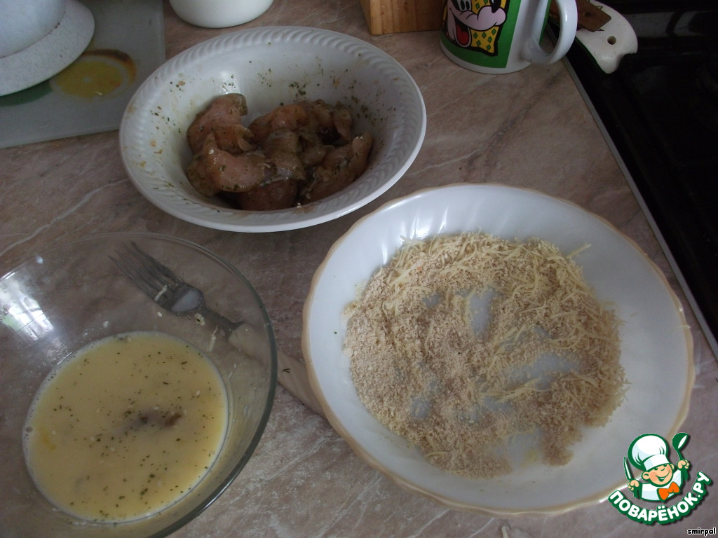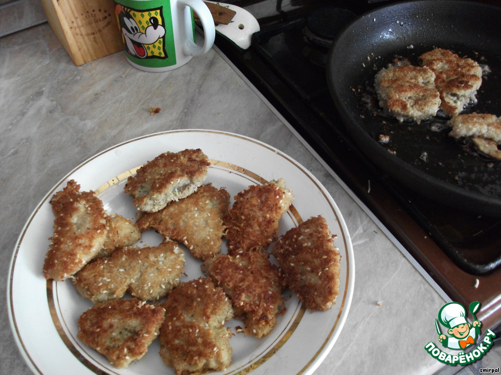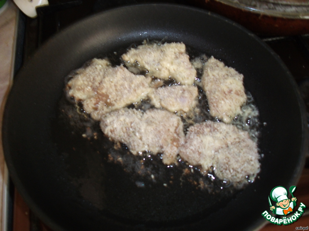 Обмакнуть каждый кусочек во взбитое яйцо, обвалять в панировке (все ингредиенты смешать) и обжарить до корочки с обеих сторон.
