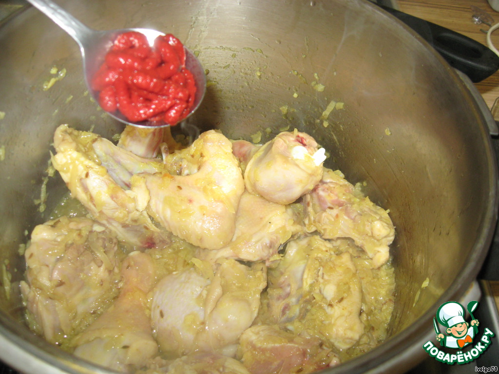 Кладем к лучку порезанную порционно курочку (баранину или телятину), солим, немного обжариваем, так чтоб она просто потеряла живой цвет.