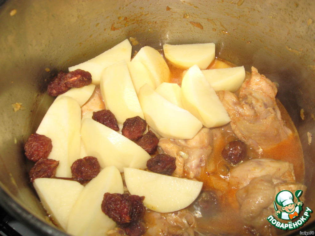 Добавляем картофель и сливу в нашу корму. Один стакан воды и закрываем еще на 5 минут нашу скороварку.