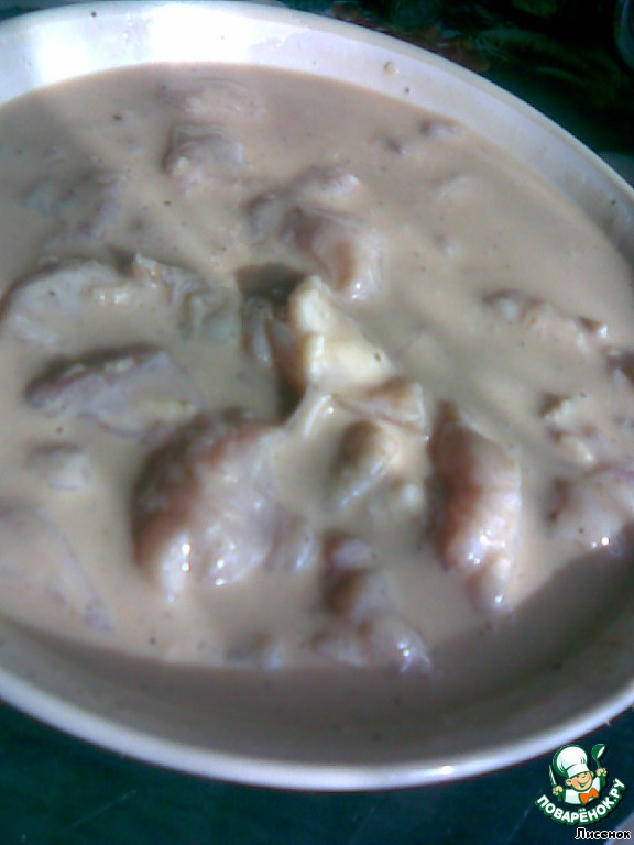 Замариновать этим маринадом кусочки курицы. Оставить на 4-5 часов. Можно и на ночь.