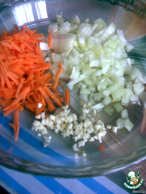 Лук измельчить, морковь натереть на крупную терку, чеснок мелко порубить.