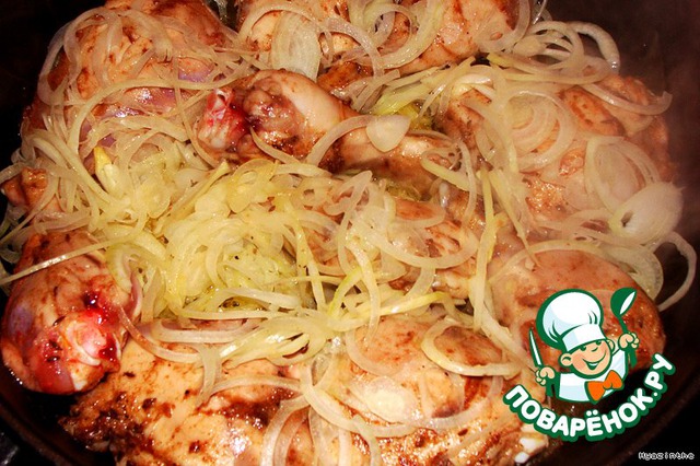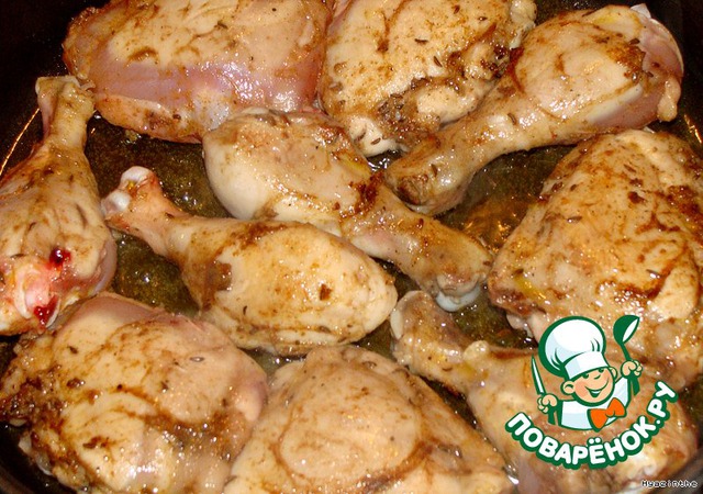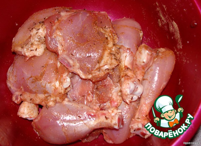 натереть курицу пряностями (я снимаю кожу с ножек-не так жирно, и делю ножки на две части по суставу)