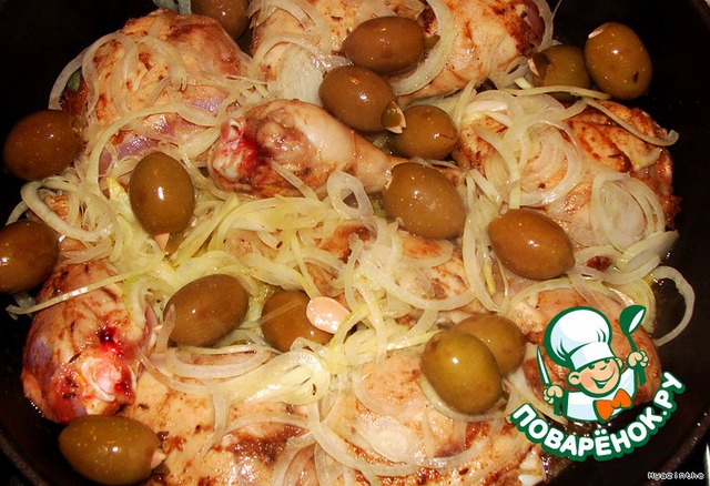 оливки и бульон, перемешать, если надо, досолить, закрыть крышкой и на небольшом огне тушить курицу примерно 30-35 минут.