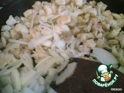 Обжарить куриное филе и грибы почти до готовности, затем добавить нарезанный лук, посолить, поперчить по вкусу, и жарить до готовности.