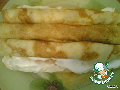 Затем сверху укладываем ещё три свернутых блинчика и снова обильно смазываем сметаной. И так каждый новый ряд, уменьшаем количество блинов. Два и вконце - один.