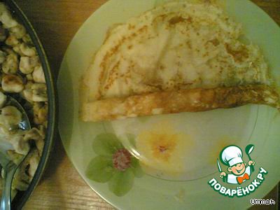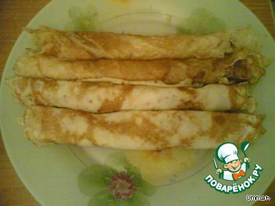 Испечь блинчики. Нам понадобится 10 шт. В каждой семье блинчики готовят по-разному, я предлагаю свой рецепт тут: http://www.povarenok.ru/recipes/show/11601/