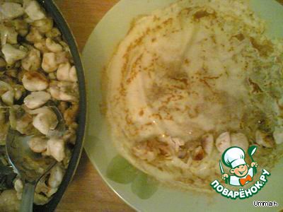 Выложить на блинчик ровный ряд обжаренного куриного филе с грибами и луком, во всю длину блинчика.