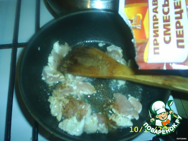 Курицу обжарить на оливковом масле 3 минуты, приправить смесью перцев.