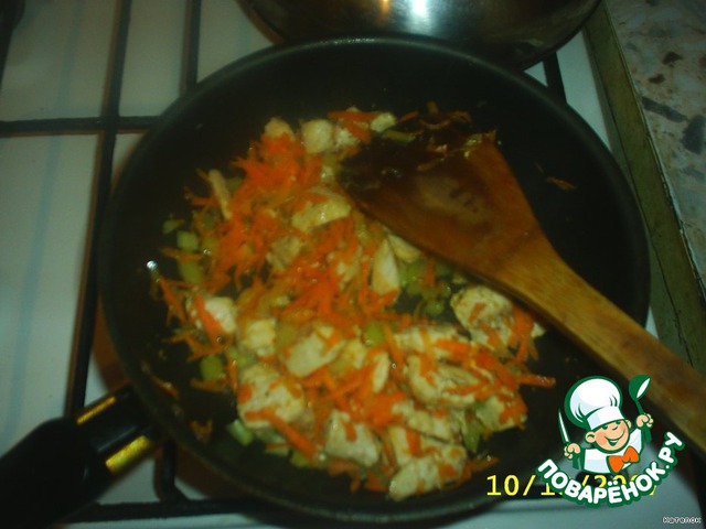 морковь, потертую на терке, перец, порезанный кубиками, тушить 5 минут! В стакане развести томатный сок, соевый соус, соль, приправу, добавить к курице!