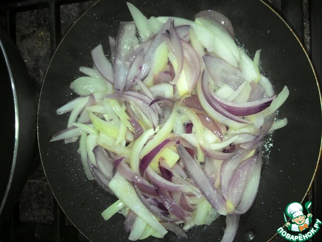 Лук разрезаем на две половинки, и режем на полоски, обжариваем на сковороде до золотистой корочки.