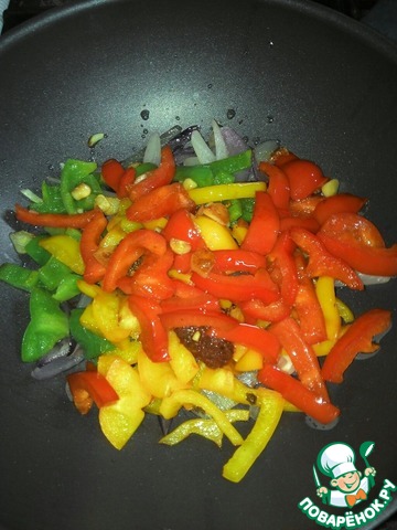 Режем болгарский перец на кусочки и обжариваем на сковороде с чесноком.