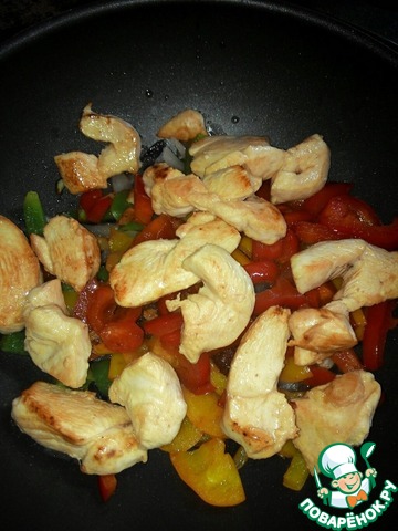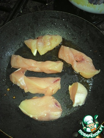 На отдельной сковороде обжариваем куриное филе, нарезанное небольшими ломтиками, до золотистой корочки.