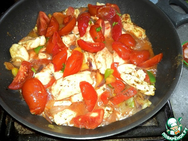 Потом добавляем помидоры, тушим еще 10 минут. Если в собственном соку, то можно с соком вместе.