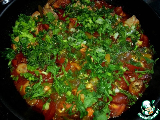 Режем мелко зелень, посыпаем щедро и тушим еще 5 минут.