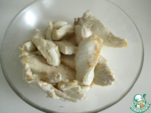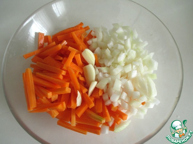 Морковь нарезать брусочками, болг. перец - тонкими полосочками, лук - кубиками. Курицу нарезать на куски.