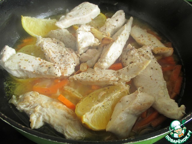 На той же сковороде припустить морковь и лук до прозрачности. Добавить свежий лимон, разрезанный на четверти и соленый лимон, который я готовлю по этому рецепту - http://www.povarenok .ru/recipes/show/406 15/ (убрать пробелы в ссылке). Добавить курицу, болгарский перец, бульон, посолить, поперчить, перемешать. Накрыть крышкой и тушить на маленьком огне 45 минут, если у Вас целая курица и 20 минут, если - только куриные грудки.