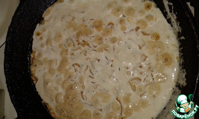 Далее жарим лук до золотистого цвета. Как только обжарили лук до нужного цвета-добавляем сметану с чесноком и чуть-чуть тушим лук в сметане. Нужно чтоб сметана взяла вкус и цвет лука.