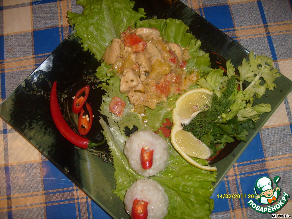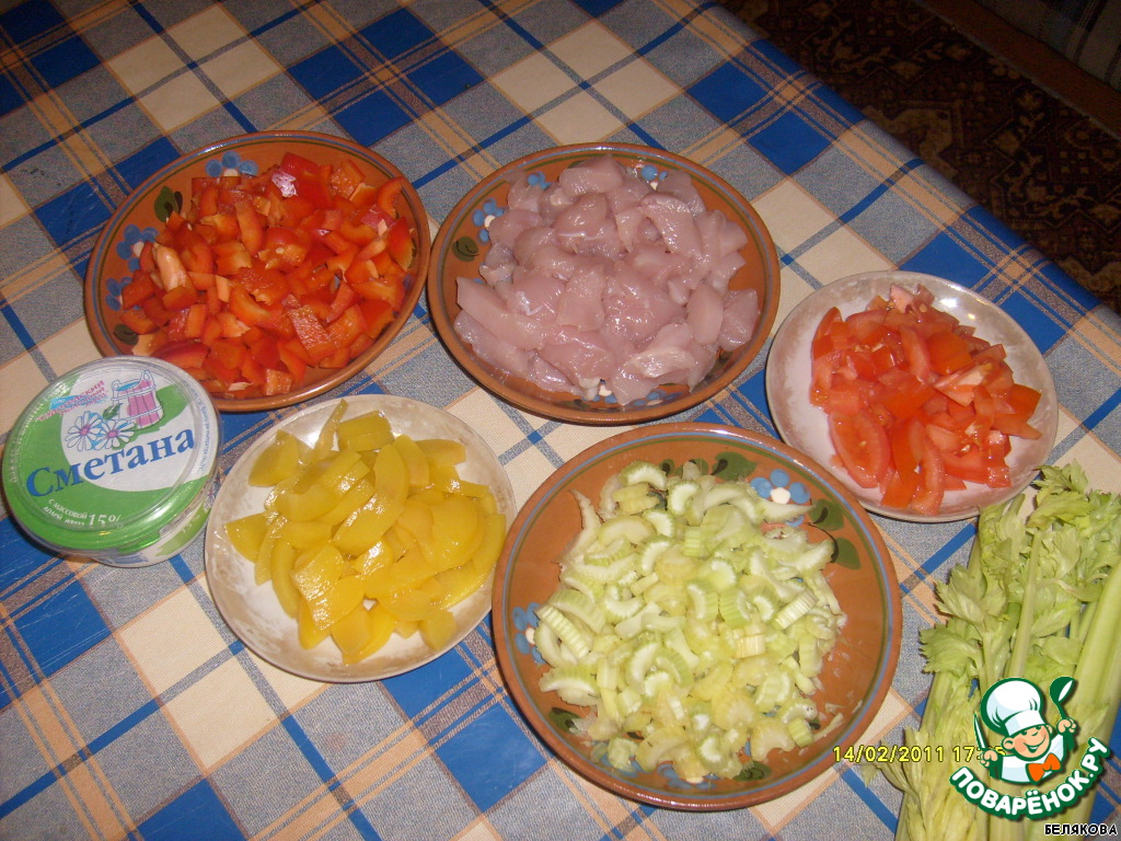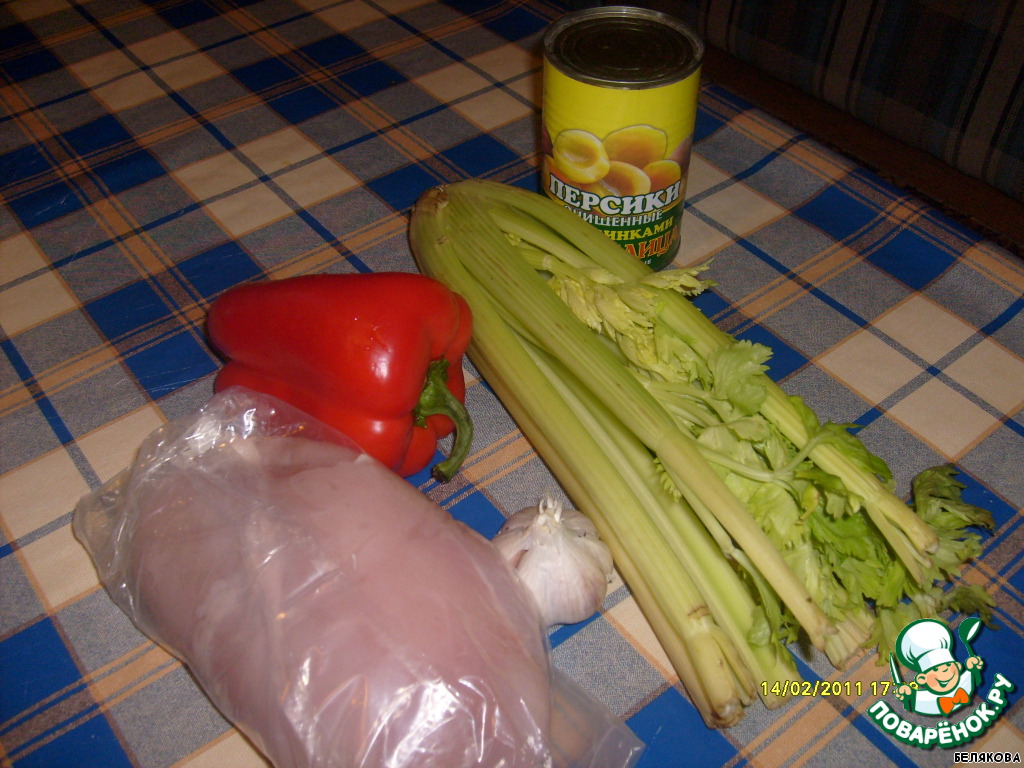 Обжариваем курицу до "побеления", добавляем сельдерей, помидор. Через минут 7 - кусочки персика. Пробуем мясо на готовность, добавляем любимые специи (для курицы, карри, хмели-сунели). Заливаем сметаной, давим пару зубчиков чеснока.