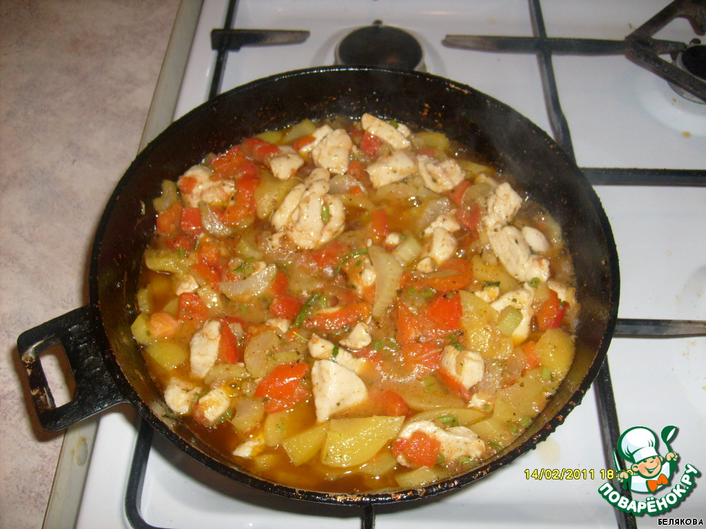 В разогретое растительное масло бросаем сладкий перец, немного обжариваем и добавляем куриное филе. Думаю, подойдут и кусочки курицы...