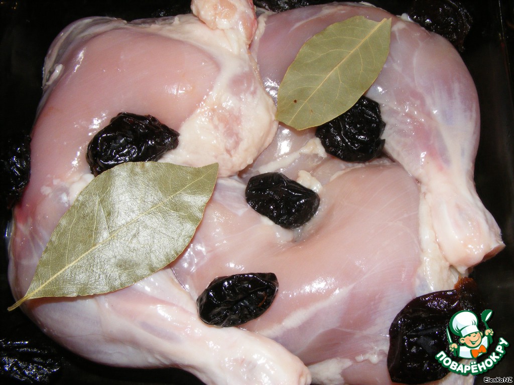 Снимаем шкурку с окорочков и укладываем в кастрюлю, с черносливом и лавровым листом.