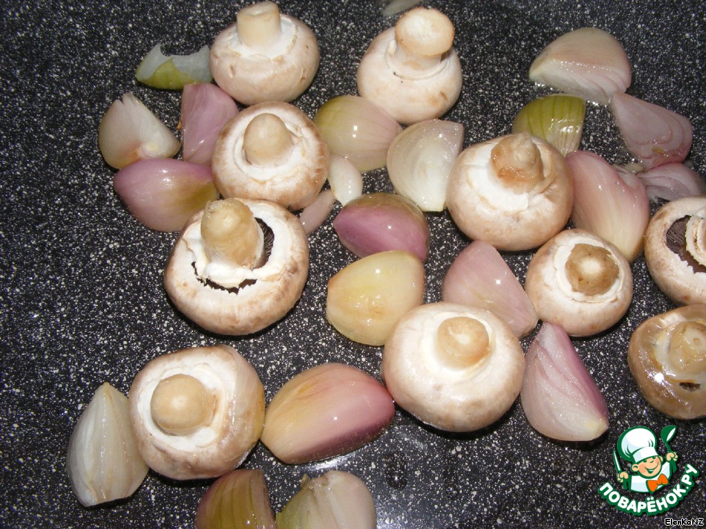 Чистим лук , если луковицы большие, разрезаем пополам. Моем шампиньоны.