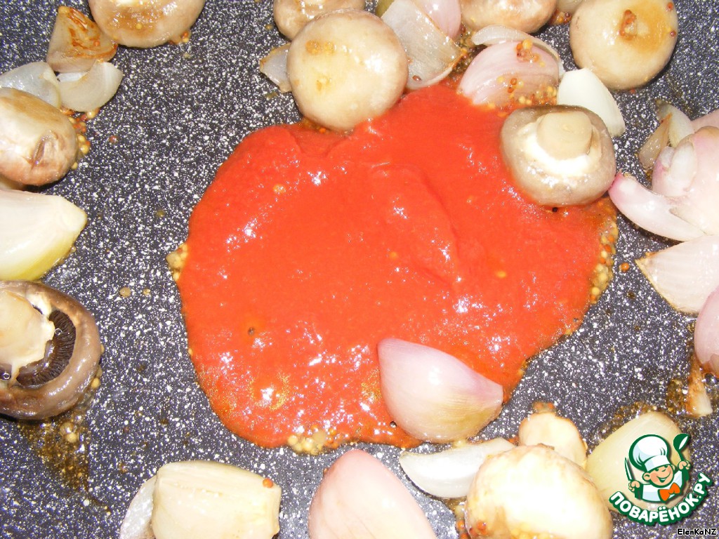 К грибам и луку добавляем сахар, горчицу, томатное пюре, пиво и куринный бульон.