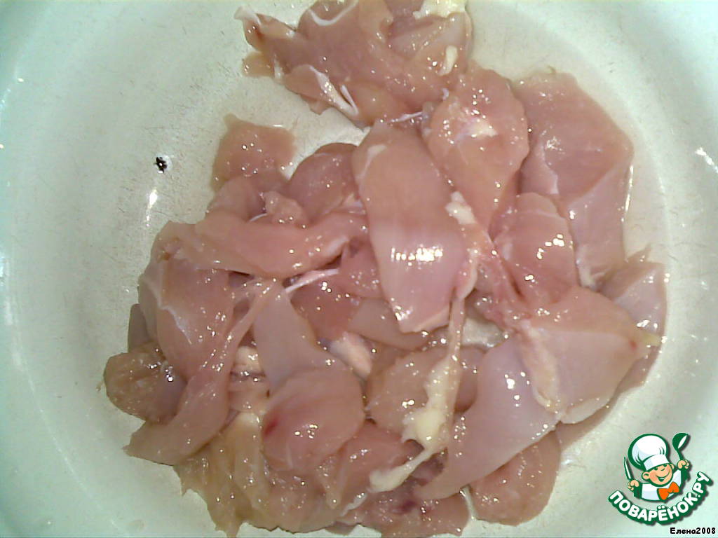 Режем крупными кусками куриное филе. Добавляем лимоный сок, соевый соус, чеснок(нарезанный на 4 части), сахар 1 ч л., смесь трав 0,5 ч.л. (вобще, кто как любит - можно меньше, а можно и больше), черный перец (если есть в хозяйстве имбирь - добавьте).