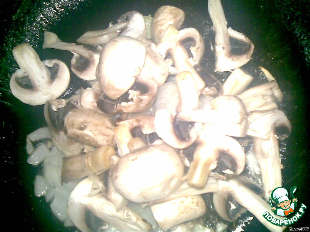 крупно строгаем вымытые шампиньоны (можно на 4 части или пополам).