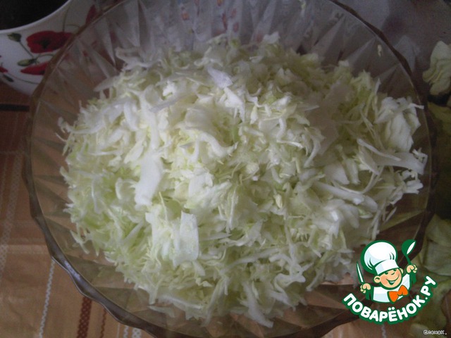 Капусту мелко нарезаем или шинкуем в комбайне, добавляем соль, сахар и немного перетираем.