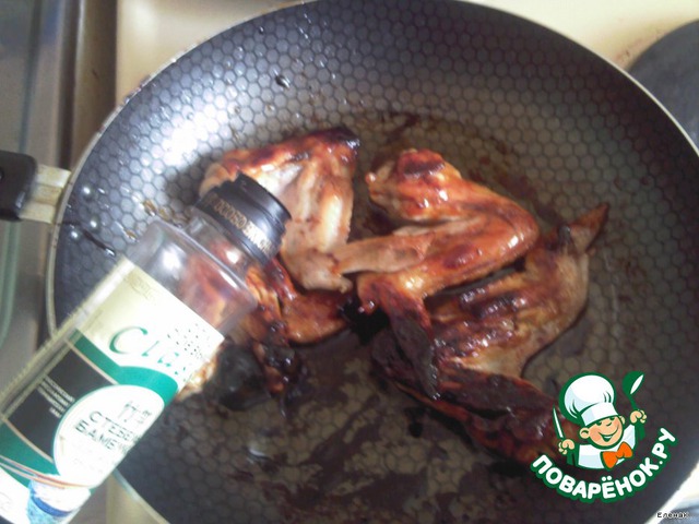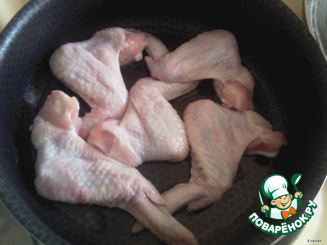 Куриные крылышки моем, обсушиваем и обжариваем на растительном масле. Я немного над ними издеваюсь, надламываю суставчики, чтобы лучше прилегали к сковороде.