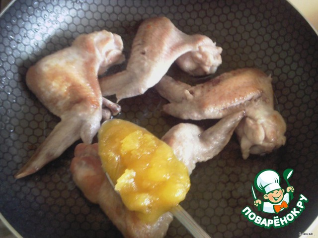 Теперь берем крышку меньшего диаметра, чем сковорода, прижимаем крылышки и обжариваем немного. Мед карамелизуется, важно следить, чтобы не подгорал.