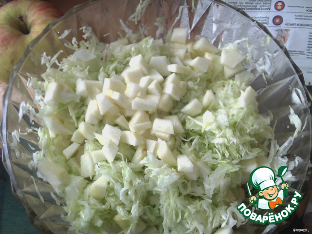 Яблоко чистим, некрупно режем, добавляем к капусте, заправляем майонезом.