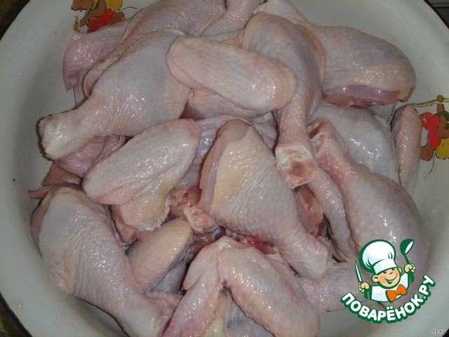 Для начала необходимо подготовить то, что будет мариноваться. Наши крылья и голени (охлажденные, не замороженные) я промыла и обсушила.