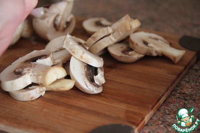 5-6 шампиньонов нарезаем таким вот образом: вдоль, чтобы не испортить вид наших красивых грибочков. Полукольцами стругаем лук.