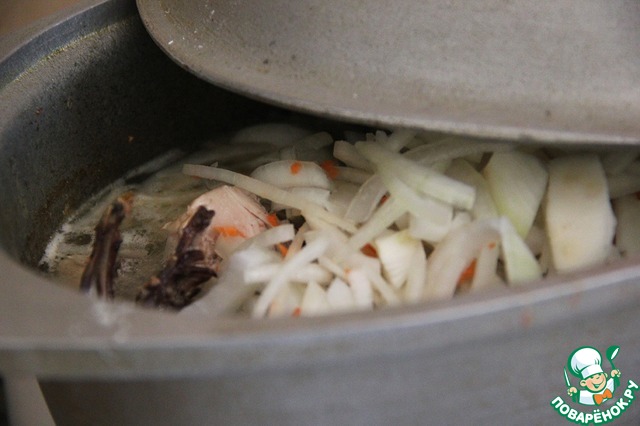 Слегка обжариваем ее в сотейнике. Залить ее водой, чтобы покрыть курицу жидкостью. Посолить, поперчить, можно добавить приправу для курицы.