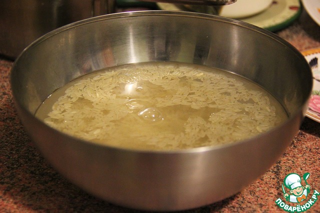 Для тех, кто хочет подавать блюдо в качестве второго: готовим гарнир, рис. Предварительно замачиваем его.