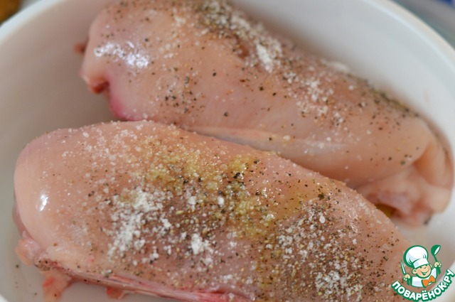 Тщательно натереть грудки солью, перцем и оливковым маслом.