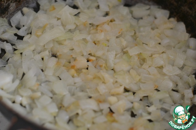 Мелко порезать лук и чеснок, обжарить в сковороде на оливковом масле, помешивая и не давая зажариться, в течение 10 минут.