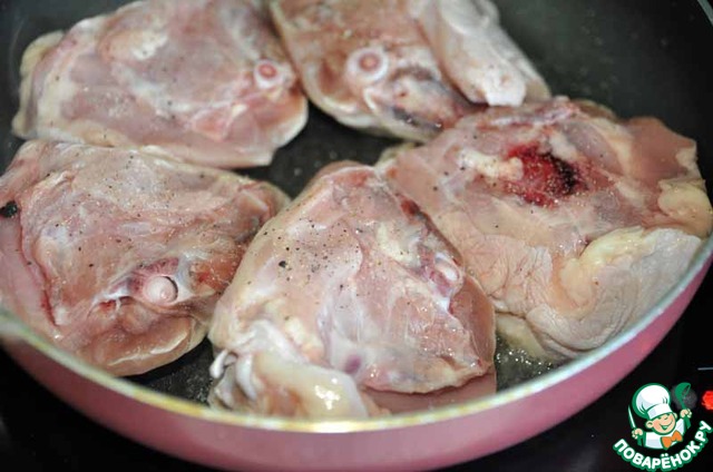 Наливаем на сковороду масло, нагреваем на максимальном огне, кладём бёдра кожей вниз. Обжариваем, не закрывая крышки, до румяности (около 7-8 минут).