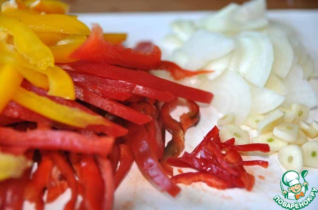 Овощи моем, чистим. Перцы нарезаем тонкими полосками, лук полукольцами, чеснок пластинками.