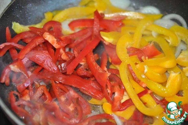Добавляем болгарский перец и чили, перемешиваем, жарим на максимальном огне 5 минут.
