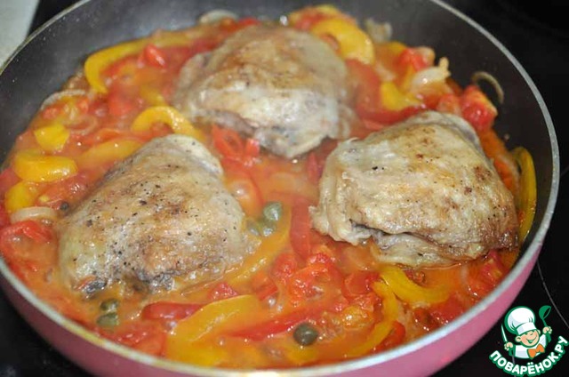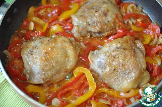 Кладём сверху обжаренные бёдра, немного утопив их в соусе (я положила три бедра).