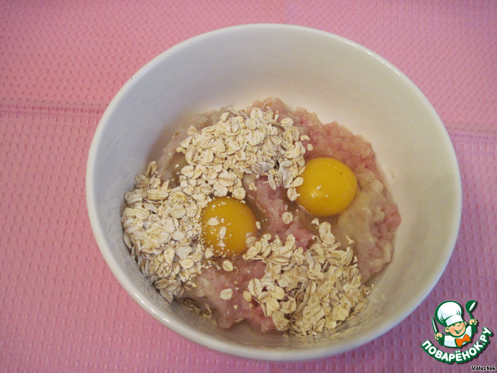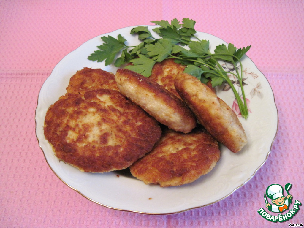 Сформировать плоские шницеля, обвалять в сухарях и положить на сковороду с кипящим растительным маслом.