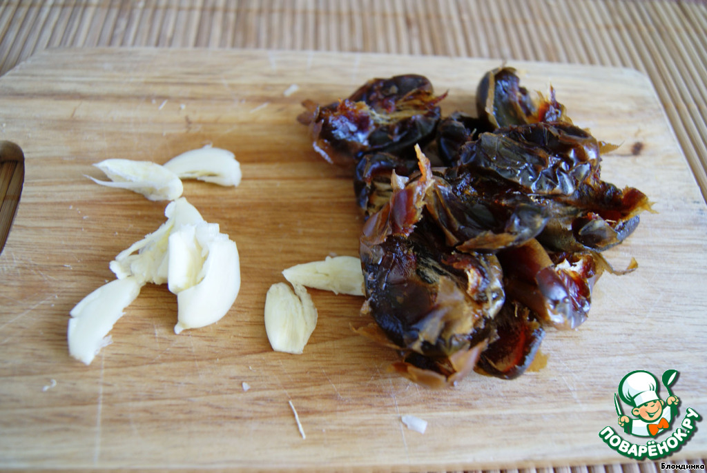 Очищаем финики от косточек, раздавливаем дольки чеснока.