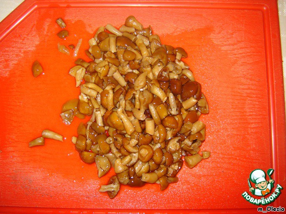 Нарезаем опята на кусочки. Можно использовать другие грибы. Я уже пробовала это блюдо с шампиньонами. Но с опятами мне и мужу понравилось больше.