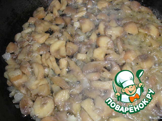 Грибочки, лук режем, наливаем в сковороду растительное масло и отправляем тушиться.