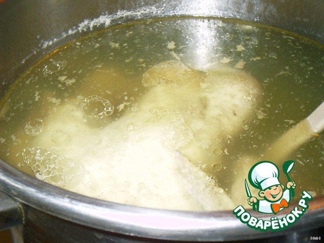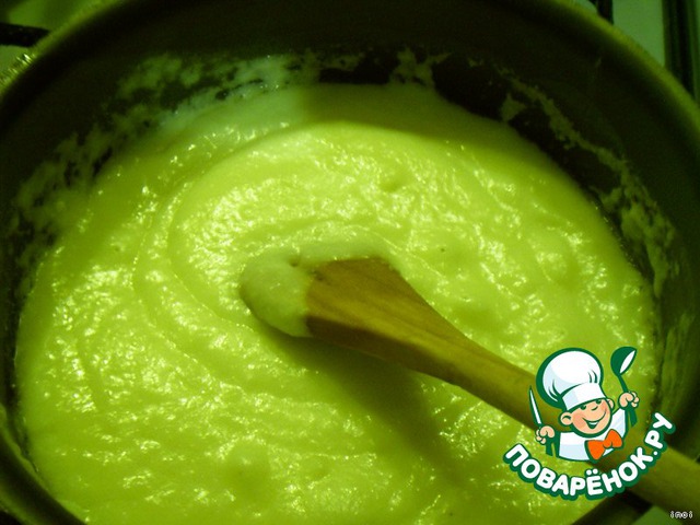 Когда мука пережарится, введём в неё стакан холодного молока, а затем стакан куриного бульона, не забывая всё это энергично перемешивать, чтобы у нас получилась однородная масса без комков. Доводим до кипения и снимаем с огня. Даём немного остыть, чтобы потом яйцо не свернулось.