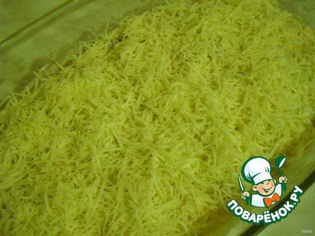Выливаем наш соус в курицу, добавляем туда 1/3 натёртого сыра и всё перемешиваем. Хотелось бы заметить: в этом блюде чем больше сыра, тем вкуснее.